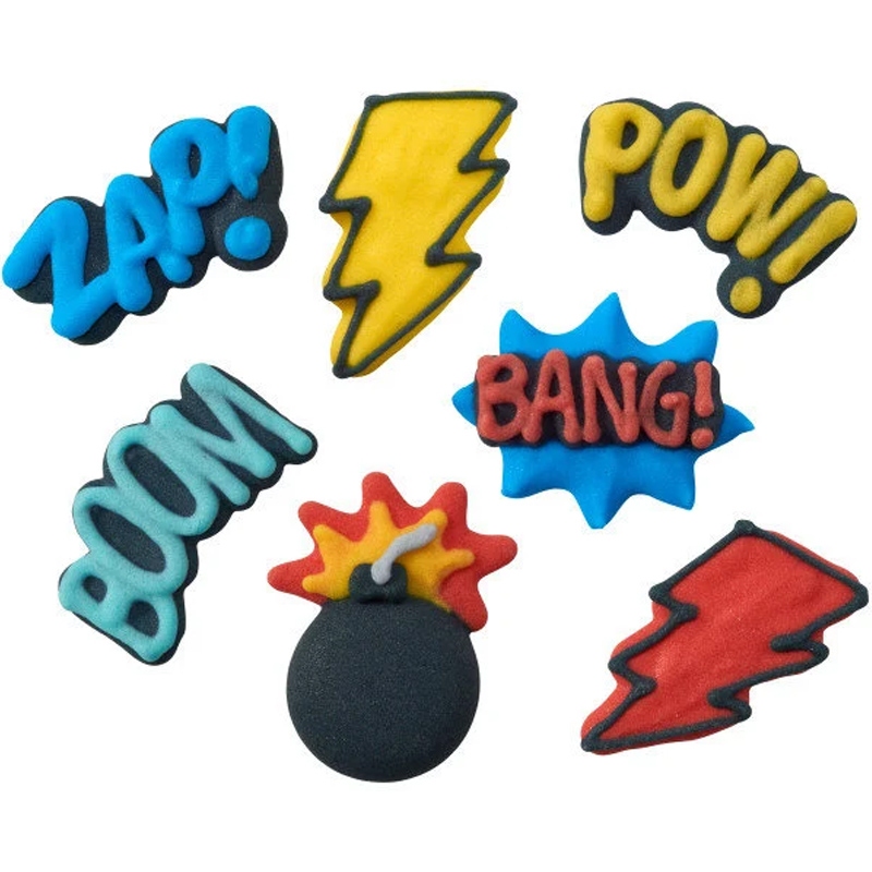 Zestaw figurek cukrowych w kształcie kilku kształtów z charakterystycznymi dymkami komiksowymi, idealnie nada się do udekorowania małego i średniego tortu, oraz innych okazjonalnych wyrobów cukierniczych.