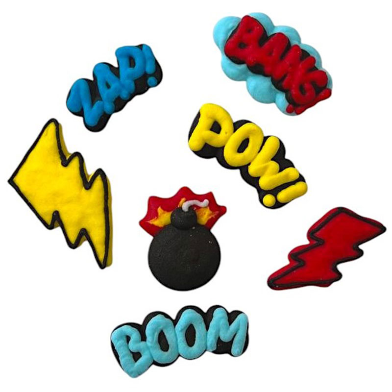W zestawie znajdują się popularne charakterystyczne teksty odgłosów podczas bójki w komiksach takich jak: ZAP!, POW!, BOOM!, BANG! oraz bombą i dwoma błyskawicami.