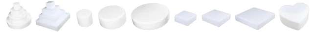 Atrapy o wysokości 3 cm standardowo nie posiadają zaokrąglonych krawędzi, dzięki czemu można użyć ich jako podwyższenie prawdziwych tortów w stylu angielskim.