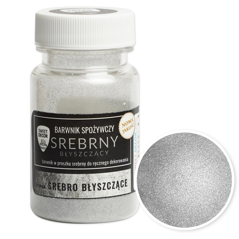 Srebro w proszku brokatowym. Łatwy w użyciu barwnik spożywczy w proszku, w kolorze srebrnym.