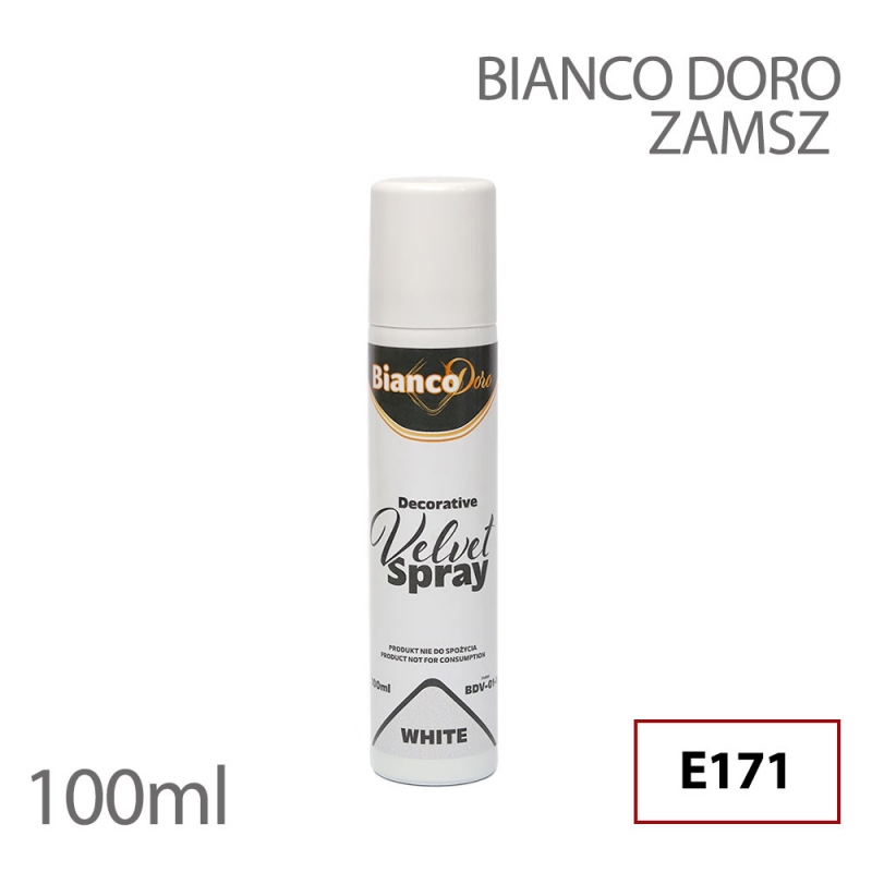 Zamsz w sprayu zawiera w swoim składzie biel tytanową E171 - nie nadaje się do tworzenia dekoracji spożywczych. Polecany do wybielania oraz barwienia dekoracji nie przeznaczonych do spożycia.
