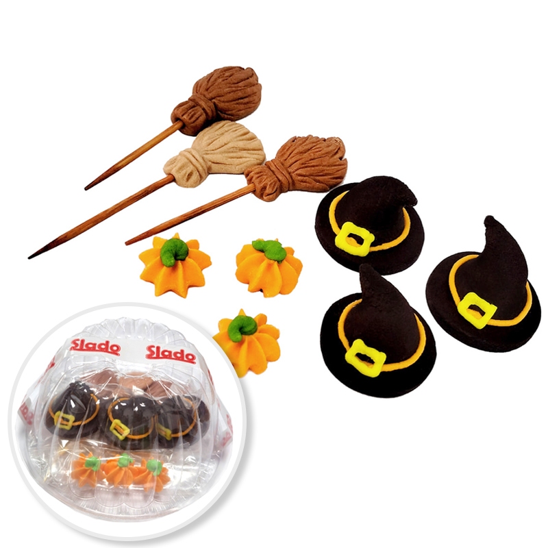 Halloweenowe dekoracje cukrowe w kształcie mioteł, kapeluszy i dyń to idealna dekoracja dla różnorodnych tortów i ciast.
