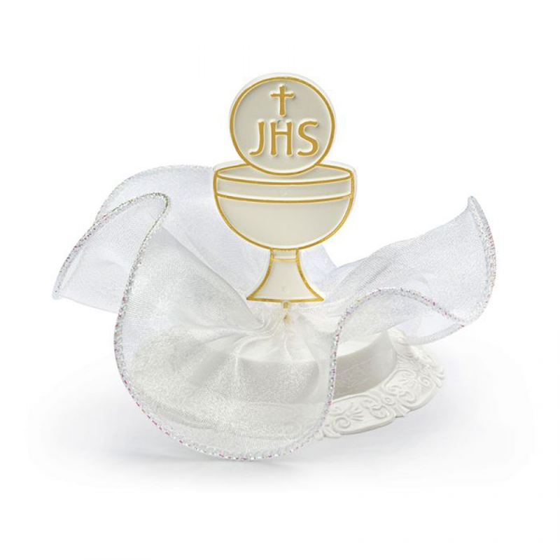 Zestaw dekoracji cukrowych w kształcie kielicha i hostii to doskonały wybór na przyjęcie komunijne aby udekorować tort solenizanta.