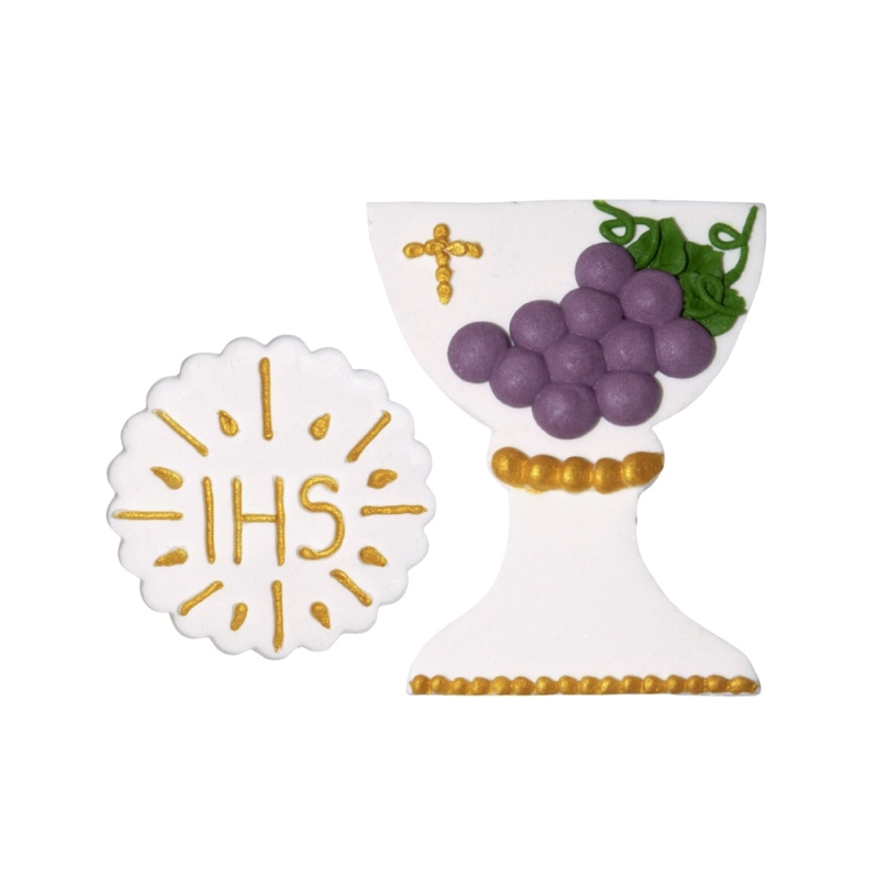 Dekoracje wykonane z cukru przedstawiają tradycyjny kielich wraz z Hostią - doskonała dekoracja na święto Pierwszej Komunii Świętej. Dzięki eleganckiemu wykonaniu oraz dbałość o szczegóły, zestaw ten pięknie się prezentuje, jak również jest łatwy w użyciu, co pozwala na stworzenie efektownej dekoracji.