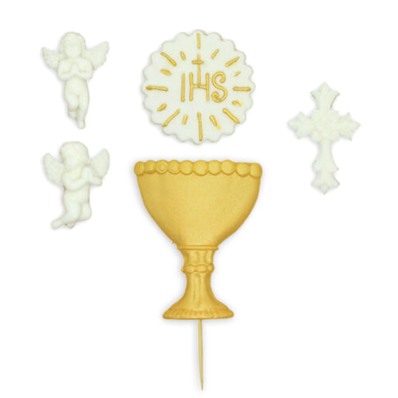 Dekoracje komunijne, przedstawiające kielich z hostią oraz dwoma biało złotymi gołąbkami. Dekoracje wykonana z cukru lukrowego.