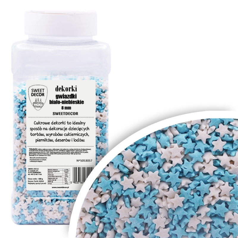 Kolorowa posypka cukrowa w kształcie białych i niebieskich gwiazdeczek. Posypka charakteryzuje się wspaniałym głębokim kolorem oraz słodkim zapachem. Cukrowe gwiazdki doskonale podkreślą wyjątkowość świątecznych wypieków.