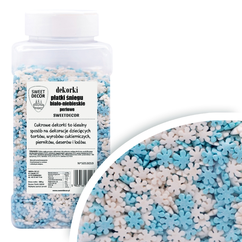 Kolorowa posypka cukrowa w kształcie niebieskich i białych płatków śniegu. Posypka charakteryzuje się wspaniałym głębokim kolorem oraz słodkim zapachem. Cukrowe śnieżynki doskonale podkreślą wyjątkowość świątecznych wypieków.