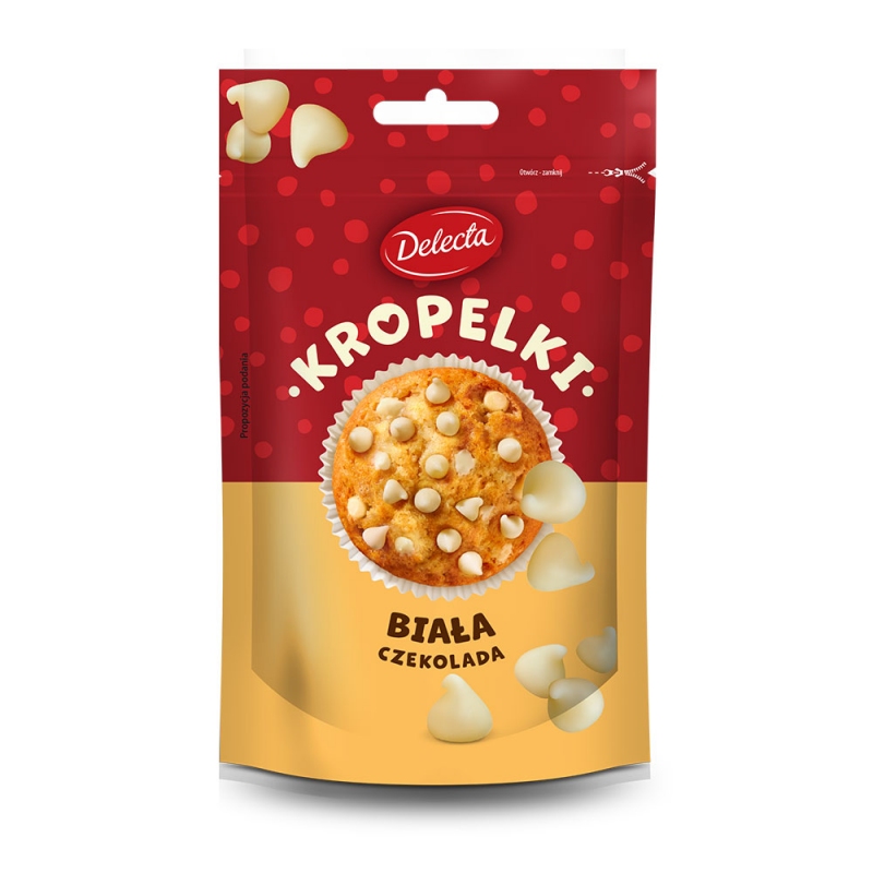 Kropelki z białej czekolady idealne do ciast, ciasteczek, muffinek oraz jako szybka polewa i dekoracja deserów.