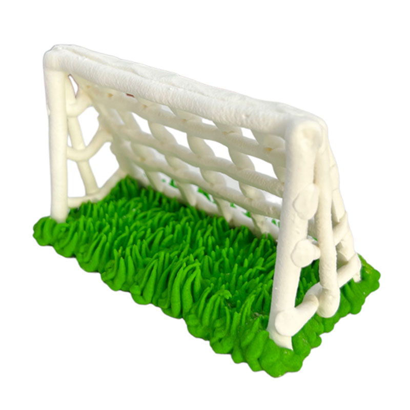 Figurka cukrowa w kształcie bramki do piłki nożnej z trawą to świetna ozdoba na tort dla fanów sportu. Bramka w kolorze białym posiada również białą siatkę z lukru, natomiast u dołu figurki znajduje się zielona bujna trawa.