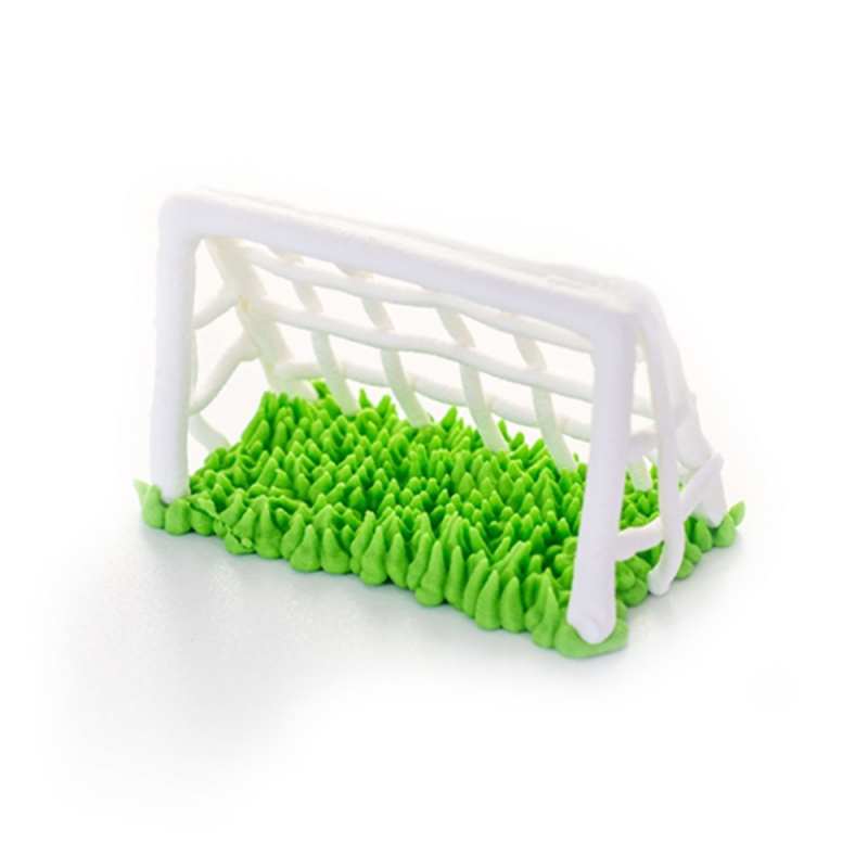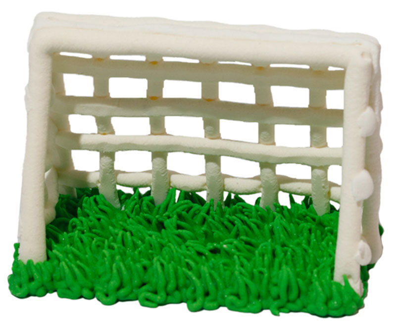 Figurka cukrowa w kształcie bramki do piłki nożnej z trawą to świetna ozdoba na tort dla fanów sportu. Bramka w kolorze białym posiada również białą siatkę z lukru, natomiast u dołu figurki znajduje się zielona bujna trawa.