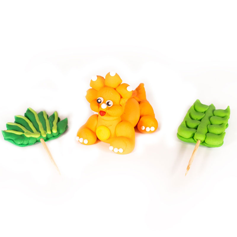 Zestaw figurek cukrowych w kształcie pomarańczowego dinozaura Sara, idealnie nada się do udekorowania małego i średniego tortu, oraz innych okazjonalnych wyrobów cukierniczych.