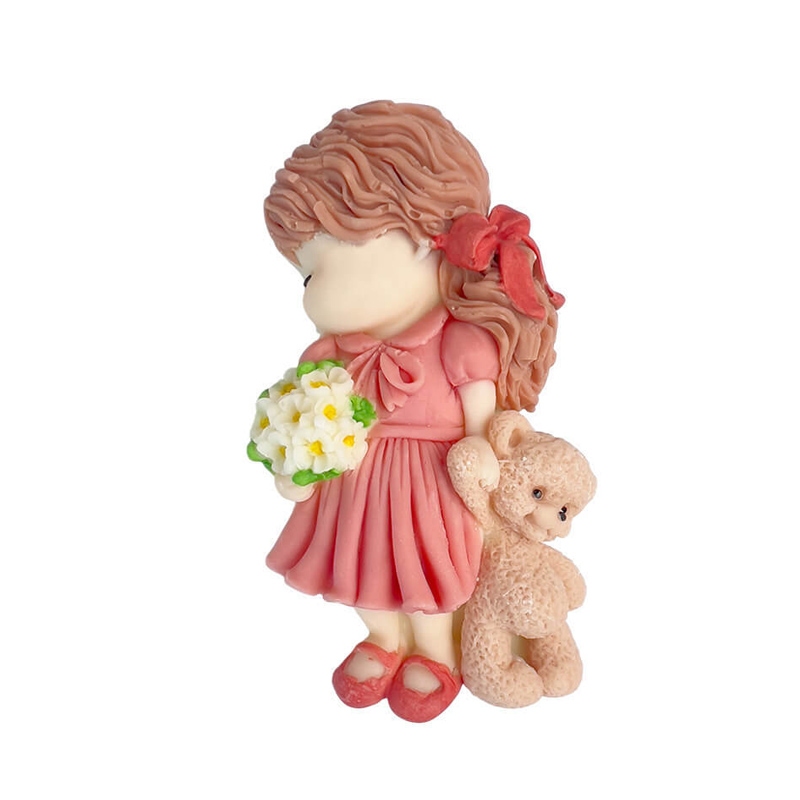 Figurka dziewczynki z misiem pięknie komponuje się z pastelowymi dekoracjami, kwiatami cukrowymi oraz topperami z imieniem. Może być centralnym elementem tortu lub subtelnym dodatkiem podkreślającym jego charakter.