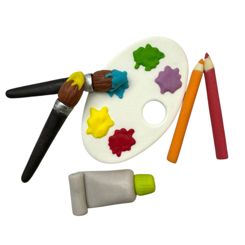 Figurki cukrowe w kształcie elementów zestawu malarskiego - takie jak paleta malarska, dwa pędzle oraz dwie kredki, tubka kleju lub farby.
