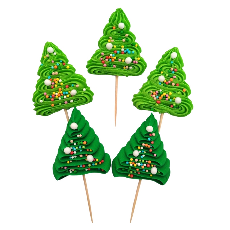 Figurki cukrowe w kształcie pięciu uroczych zielonych choinek na patyczkach - to oryginalna dekoracja na tort lub ciasto w klimacie świąt Bożego Narodzenia.