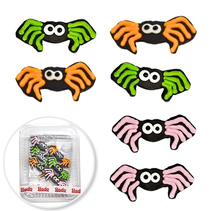 Halloweenowe dekoracje cukrowe w kształcie sześciu czarnych pająków z kolorowymi nóżkami to idealna dekoracja dla różnorodnych tortów i ciast.