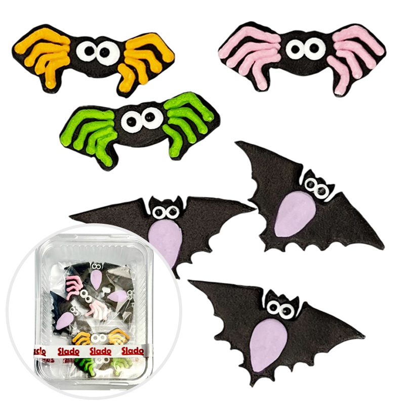 Halloweenowe dekoracje cukrowe w kształcie trzech czarnych nietoperzy oraz trzech pająków z kolorowymi nogami to idealna dekoracja dla różnorodnych tortów i ciast.