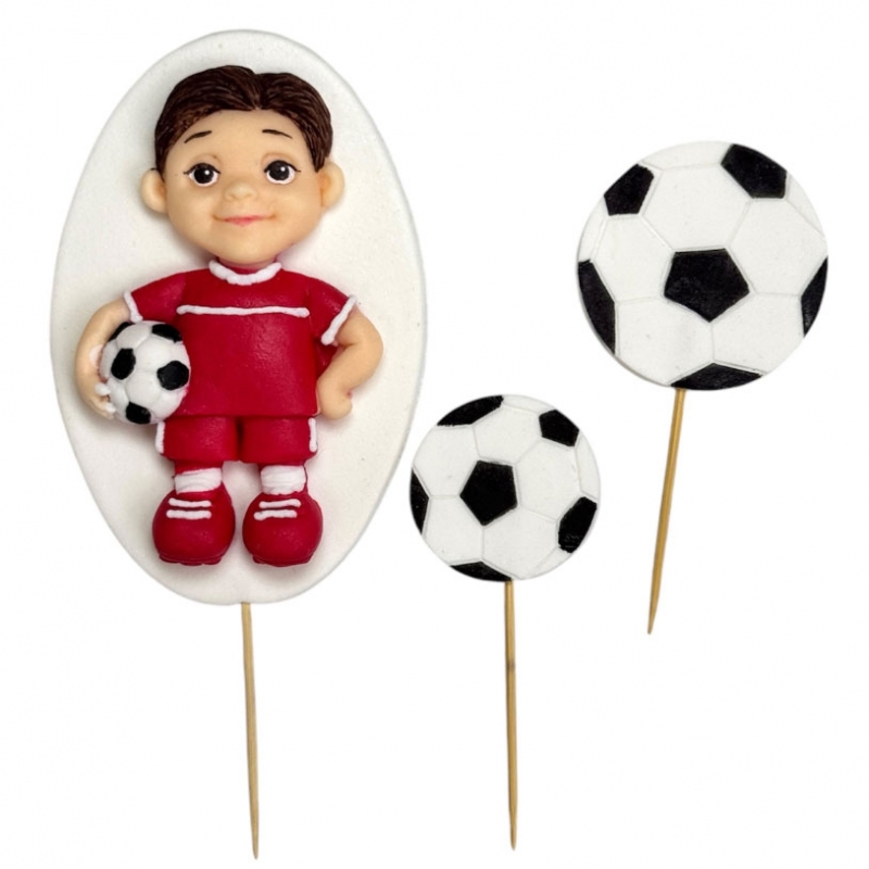 Figurki cukrowe w kształcie piłkarza na białym owalnym tle, ubranego w czerwony strój piłkarski, do piłkarza dołączone zostały również dwie piłki w dwóch wymiarach. Do każdej figurki doczepiona została wykałaczka ułatwiająca postawienie figurki pionowo.