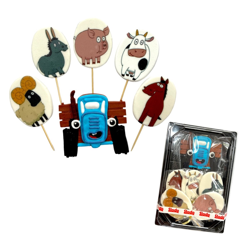 Figurki cukrowe w kształcie traktora z oczami i uśmiechem (od frontu), oraz czterech owali na patyczkach do wbicia z nadrukiem zwierząt: konia, osła, krowy, barana.