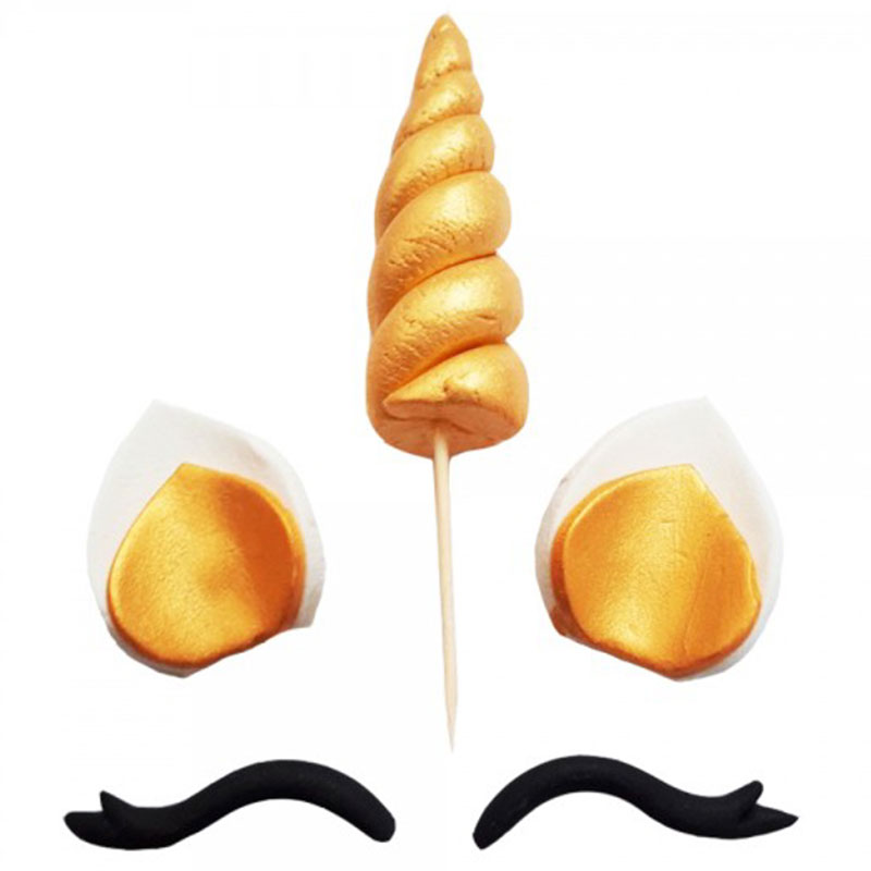 Figurki cukrowe w kształcie uszu, rogu oraz powiek jednorożca - idealnie nada się do udekorowania małego i średniego tortu, oraz innych okazjonalnych wyrobów cukierniczych.