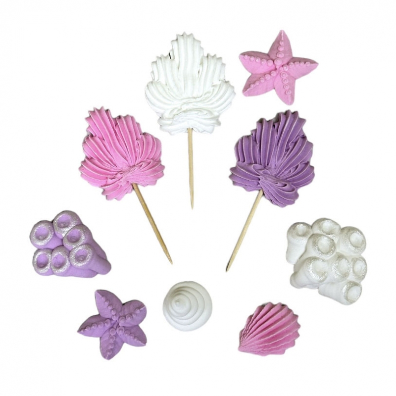 Zestaw figurek cukrowych w kształcie różnorodnych muszli oraz dekoracji z motywem morskim to doskonała dekoracja dla każdego fana morskiego klimatu.