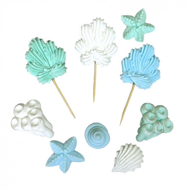 Zestaw figurek cukrowych w kształcie różnorodnych muszli oraz dekoracji z motywem morskim to doskonała dekoracja dla każdego fana morskiego klimatu.