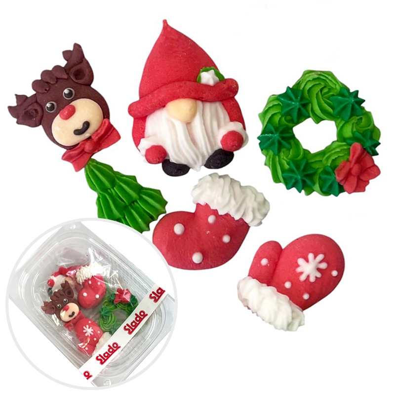 Figurki cukrowe przedstawiające ozdoby choinkowe w różnych kształtach z motywem świątecznym to urocza i oryginalna dekoracja na tort lub ciasto w klimacie świąt Bożego Narodzenia. Figurki wykonane są z masy cukrowej.