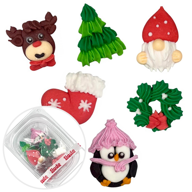 Figurki cukrowe przedstawiające ozdoby choinkowe w różnych kształtach z motywem świątecznym to urocza i oryginalna dekoracja na tort lub ciasto w klimacie świąt Bożego Narodzenia. Figurki wykonane są z masy cukrowej.