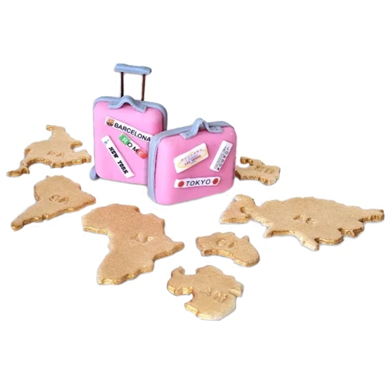 Zestaw figurek cukrowych w kształcie walizek oraz złotych kontynentów.