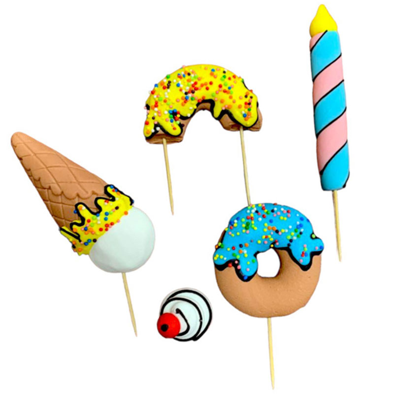 Zestaw figurek cukrowych w kształcie różnych słodkości takich jak donat, lód, cukrowa świeczka, i bezik. Doskonałe do udekorowania małego i średniego tortu dla każdego małego łasucha, oraz innych okazjonalnych wyrobów cukierniczych.
