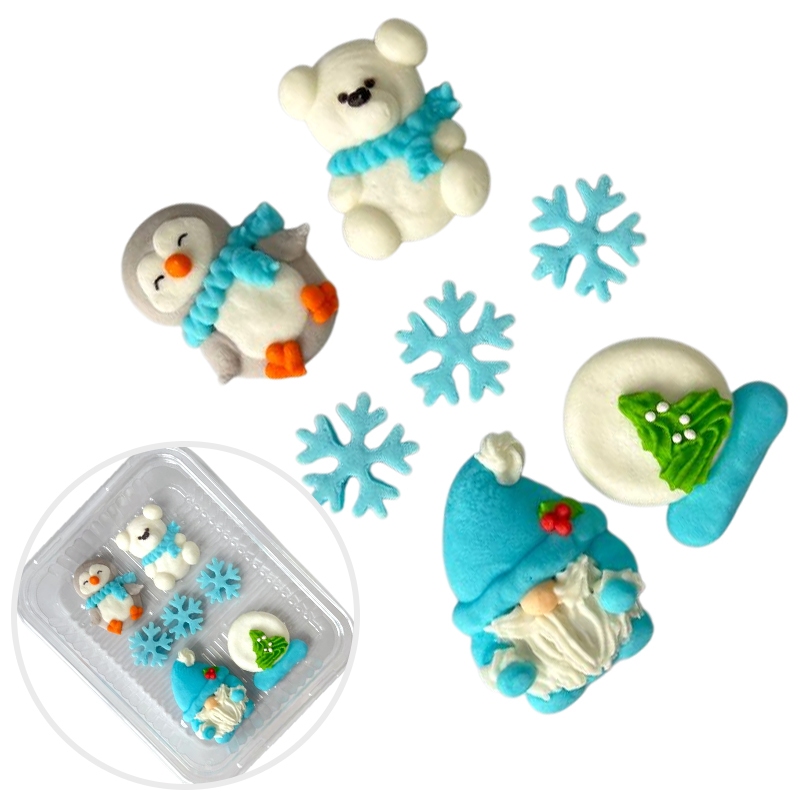 Figurki cukrowe przedstawiające motywy na Chrzest i Święta to urocza i oryginalna dekoracja na tort lub ciasto w klimacie świąt Bożego Narodzenia ale również nadająca się na chrzest dla chłopców i dziewczynek. Figurki wykonane są z masy cukrowej.