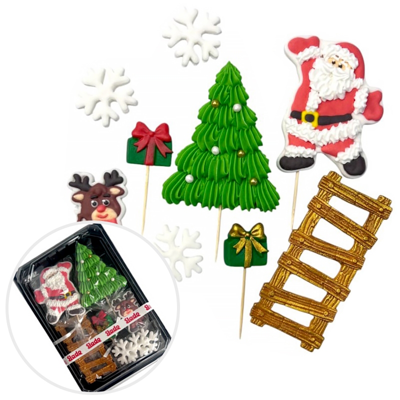 Figurki cukrowe przedstawiające drabinę, mikołaja, choinki prezentów oraz śnieżynek - to urocza i oryginalna dekoracja na tort lub ciasto. Figurki wykonane są z masy cukrowej.