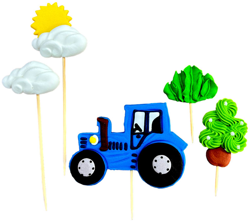 Zestaw figurek cukrowych w kształcie traktora, drzewek, oraz chmurek z słońcem. Doskonałe do udekorowania małego i średniego tortu dla każdego małego farmera, oraz innych okazjonalnych wyrobów cukierniczych dla każdego dziecka.
