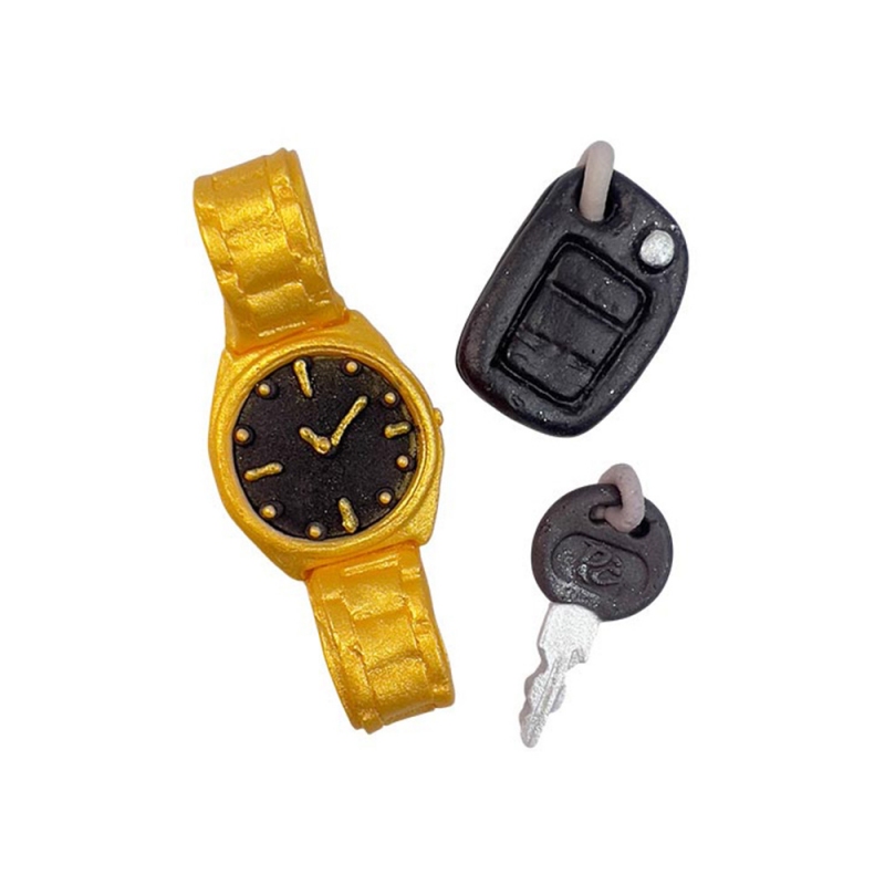 Cukrowa dekoracja w kształcie męskiego zestawu - zegarek złoty, klucz, brelok - sprawdzi się idealnie jako ozdoba ciast, ciasteczek oraz innych wypieków dla każdego mężczyzny jak również chłopaka.