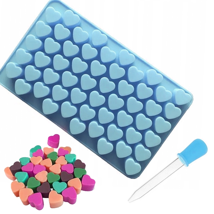 Forma silikonowa w kształcie serduszek wraz z pipetą do napełniania, doskonale nada się do przygotowania słodkich serc w formie żelków i nie tylko... Foremka wykonana jest z wysokiej jakości silikonu.