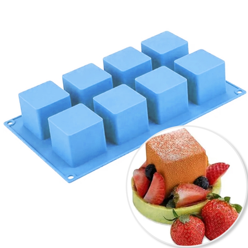 Forma silikonowa zawierająca sześciany w ilości ośmiu sztuk, doskonale nada się do przygotowania słodkich deserów w kształcie kwadratów.