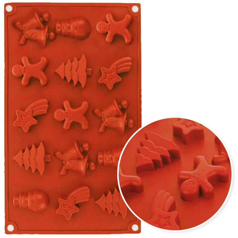 Forma silikonowa która idealnie pozwoli ci na wykonanie kilkunastu czekoladek w świątecznym klimacie. Kształty poszczególnych elementów przedstawiają: bałwanka, gwiazdę betlejemską, choinkę, dzwonki, piernikowego ludzika, (5 wzorów po 3szt). Forma nadaje się do tworzenia dekoracji z izomaltu lub czekolady w wielu odmianach.