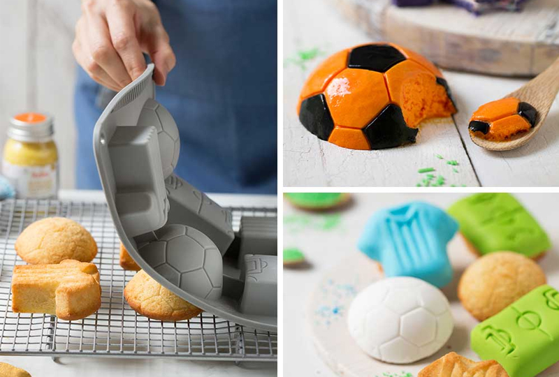 Forma silikonowa zawierająca kilka kształtów o piłkarskiej tematyce - doskonała do wykonania słodkich i wytrawnych ciastek i przekąsek na różnych okazjonalnych przyjęciach o tematyce piłki nożnej. Dzięki formie otrzymasz przepiękne wypieki w kształcie koszulki piłkarskiej, boiska i piłki nożnej, które zachwycą wszystkich!