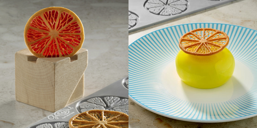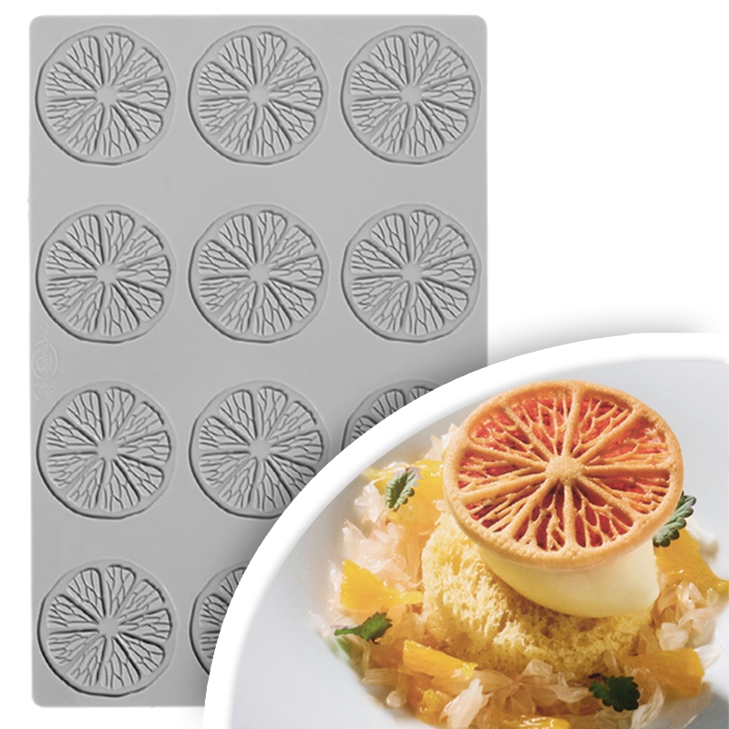 Silikonowa forma umożliwiająca wykonanie dekoracji z czekolady, izomaltu oraz wielu innych produktów cukierniczych, w fantazyjnym kształcie plastrów cytryny / pomarańczy, dając efekt minimalistycznego designu.