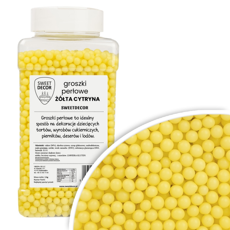 Eleganckie groszki cukrowe w kolorze jasnym żółtym to efektowna dekoracja do ciast, tortów, pierniczków, deserów i lodów. Nadają wypiekom wyjątkowego blasku i koloru, świetnie sprawdzając się zarówno w codziennym, jak i świątecznym dekorowaniu.