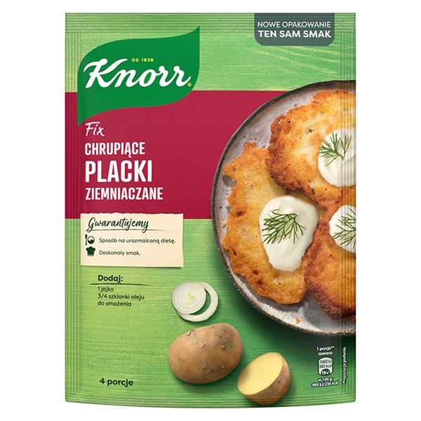 Twoje placki będą smakowały jak domowe, ponieważ do stworzenia Fixu Chrupiące placki ziemniaczane użyliśmy prawdziwych ziemniaków, które za Ciebie utarliśmy i ususzyliśmy. Odkryj idealnie doprawioną wersję znanego Ci dania, skomponowaną przez mistrza kuchni Knorr. Wypełnij kuchnię intensywnym aromatem, który sam przyciągnie domowników do stołu. Fix to prosty i szybki sposób na danie zachwycające wyjątkowym, wyrazistym smakiem.