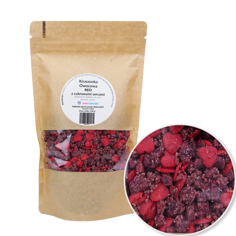 Zyskaj dla swoich wypieków i deserów wyjątkowy charakter dzięki chrupiącej posypce w formie pokruszonych ususzonych czerwonych owoców o intensywnym smaku z dodatkiem dekoracyjnych czerwonych serduszek cukrowych, które nadają słodkiego twoim potrawom i deserom!