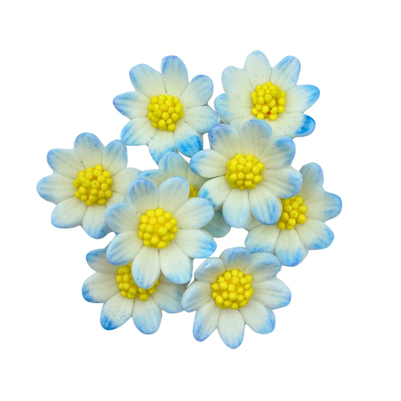 Zestaw kwiatów cukrowych w kształcie białych rumianków, doskonale sprawdzą się do udekorowania małego i średniego tortu, oraz innych okazjonalnych wyrobów cukierniczych dla każdego dziecka.