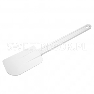 Biała łopatka do ciasta wykonana z silikonu, miękkiego materiału, nie powodującego zadrapań. Odporna na wysoką temperaturę (do 100 °C)