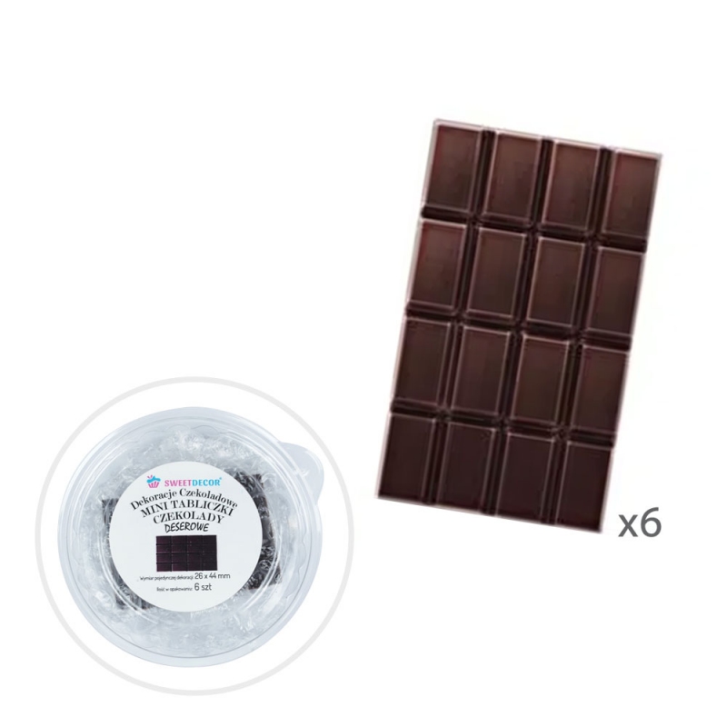 Opakowanie zawiera 6 sztuk mini tabliczek czekoladowych o wymiarach 26 x 44 mm. Tradycyjny kształt i możliwość łamania na kawałki pozwalają na szerokie wykorzystanie w dekorowaniu tortów, lodów, ciast i deserów.