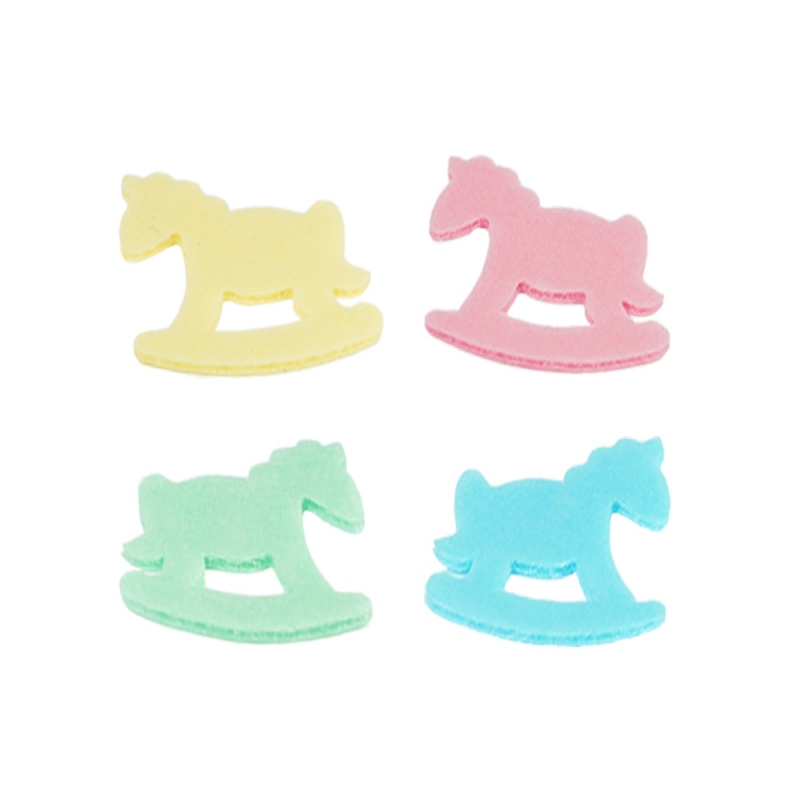 Efektowna dekoracja w kształcie koników na biegunach wykonana z barwionego opłatka do ozdobienia okazjonalnych ciast i deserów.