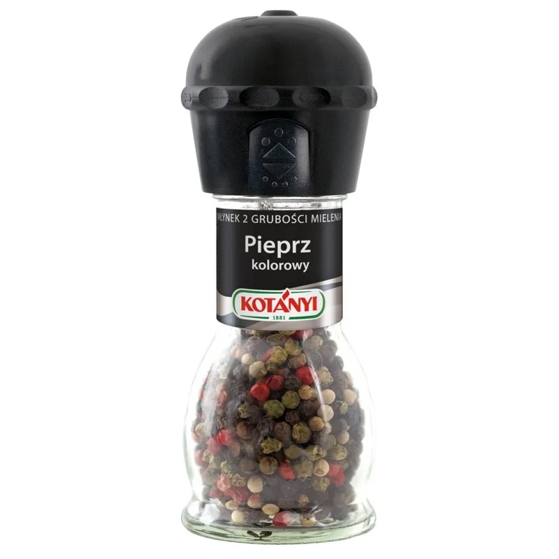 Kotányi Pieprz kolorowy – Mieszanka ziaren pieprzu w młynku z dwoma grubościami mielenia.