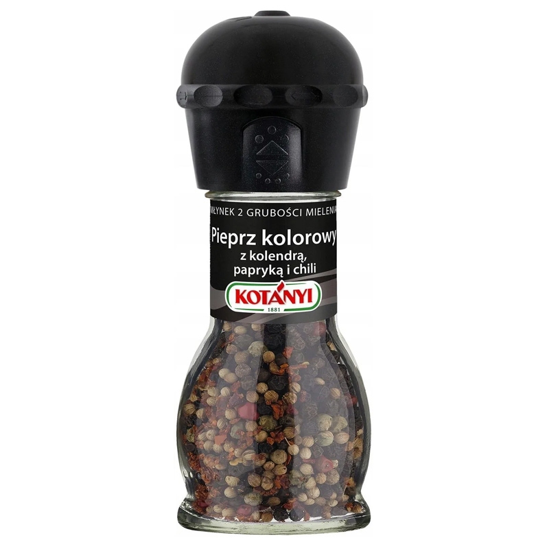 Kotányi Pieprz kolorowy z przyprawami – Mieszanka ziaren pieprzu i przypraw takich jak kolendra, papryka i chili, w młynku z dwoma grubościami mielenia.