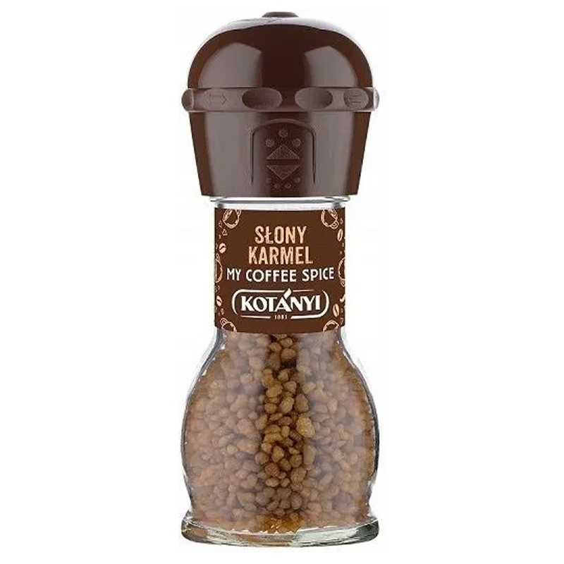 Kotányi Słony Karmel – To aromatyczny gruboziarnisty cukier o karmelowym smaku - w młynku z dwoma grubościami mielenia.