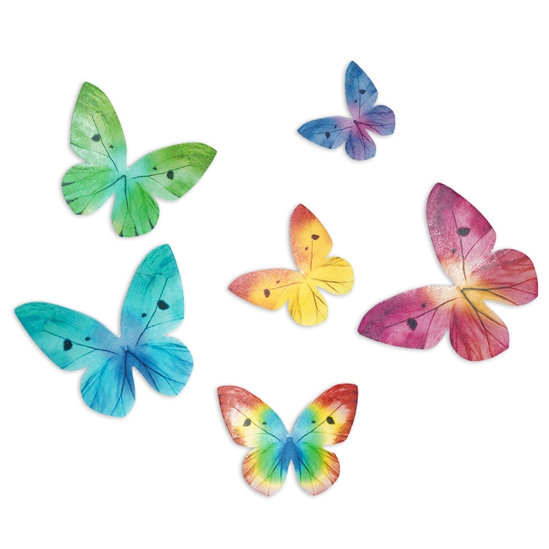 Efektowna dekoracja w kształcie motyli wykonana z barwionego opłatka do ozdobienia okazjonalnych ciast i deserów.