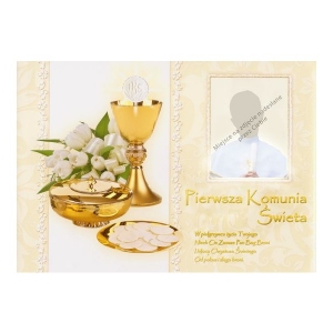 Jadalny opłatek na tort z wzorem komunijnym. Idealna dekoracja z cienkiego opłatka, który po nałożeniu na biały krem staje się delikatnie miękki i idealny do krojenia.
